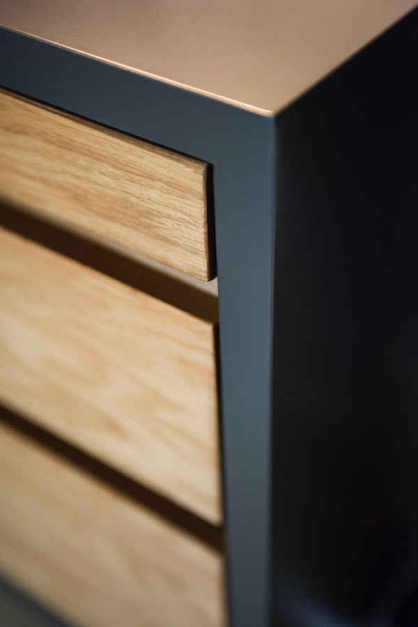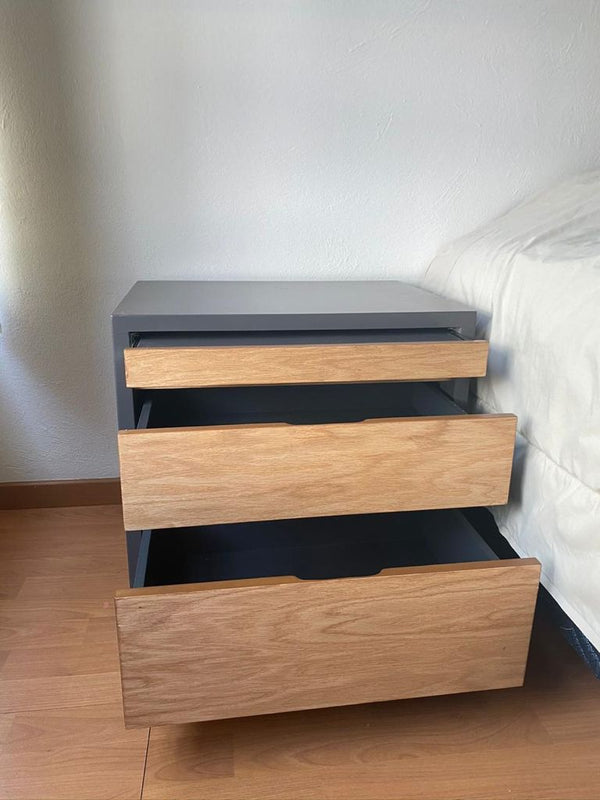 Buró con 3 cajones, frentes de madera encino natural y MDF en gris obscuro/blanco