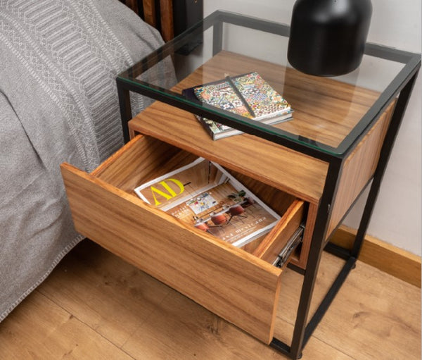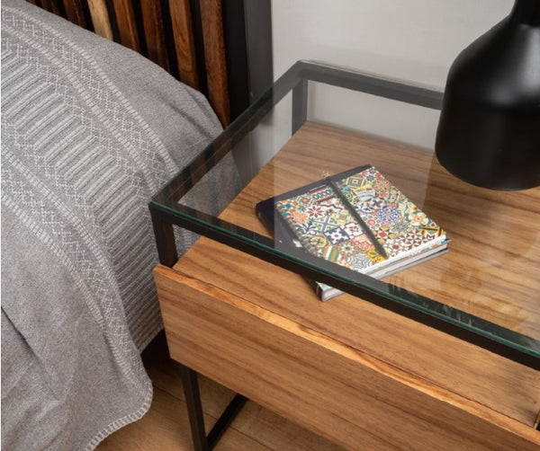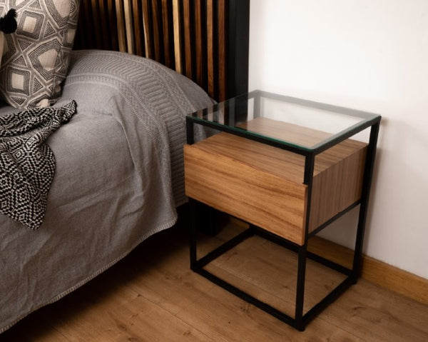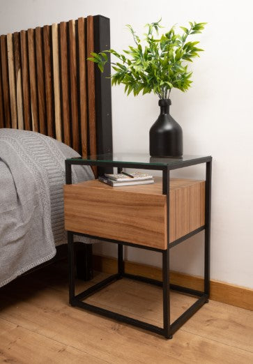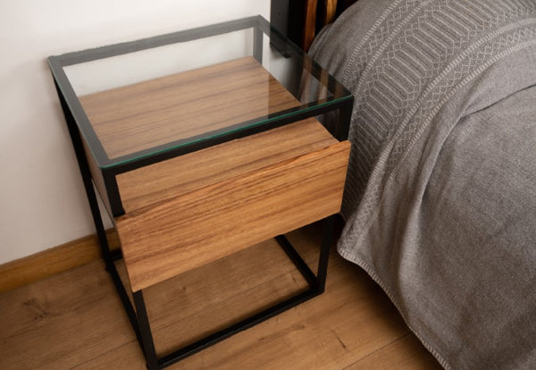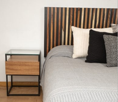 Este buró es una propuesta moderna y a la vanguardia para tu dormitorio. Su combinación de parotta y herrería le darán un toque auténtico a tu recámara.