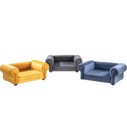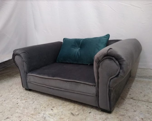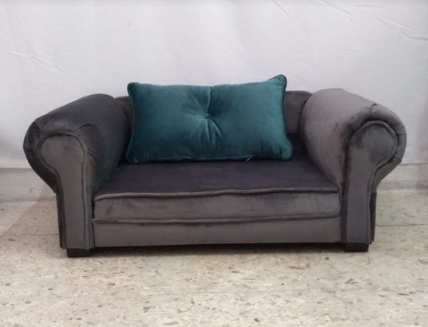 Cama rectangular con bordes redondos, elaborado en MDF con espuma de poliurteano, en tela de poliester, textura suave. Disponibles en color Gris.