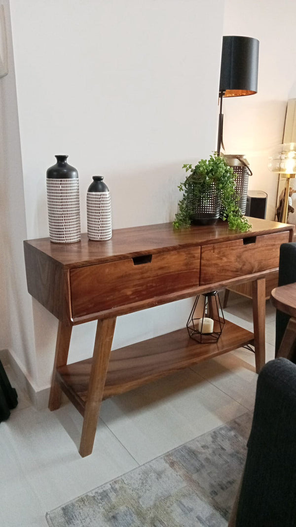 Cautivadora credenza Stella con dos cajones prácticos que convertira tu espacio en un ambiente funcional y accesible, su hermosa fabricación en madera parota le brinda resistencia y durabilidad así como calidad.