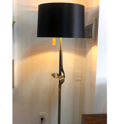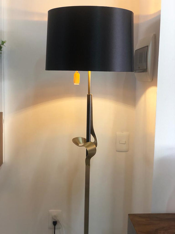 LÁMPARA DE PIE CON PANTALLA NEGRA Y BASE EN DORADO